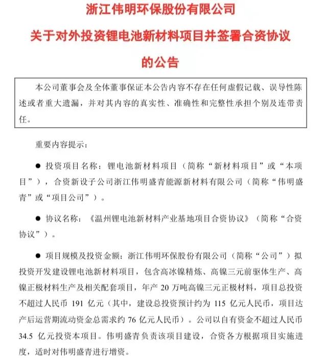 “本项目是基于公司战略发展的需要及对新能源材料行业市场前景的判断, 但行业的发展趋势、市场行情的变化等均存有不确定性,并将对未来经营效益 的实现产生不确定性影响。”在8月4日晚间的公告中,伟明环保提示风险称。