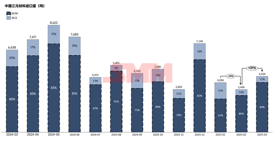 2025年3月,中国三元材料(NCM+NCA合计数值)进口量为4504吨,环比增加31%,同比减少32.15%。