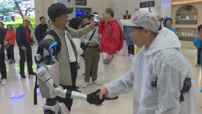 在庐山交通索道下站的检票大厅,一款科技感十足的人形机器人迈着矫健有力的步伐登场。在工作人员的操作指令下,它行云流水般完成了握手、招手、步行、下蹲等一系列拟人化动作。工作人员轻触手机应用软件,开启语音连接功能,即可提供播放音乐等智能服务。现场游客纷纷与机器人欢乐互动,感受科技与旅游深度融合的独特魅力。
