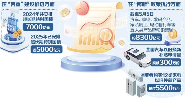 在“两新”政策执行方面,今年以来,“两新”加力扩围政策加快落地、持续显效,成为扩消费、稳投资、促转型、惠民生的重要引擎。截至5月5日,汽车、家电、数码产品、家装厨卫、电动自行车等五大类产品带动销售额约8300亿元;全国汽车以旧换新补贴申请量突破300万份,消费者购买12类家电以旧换新产品超过5500万台,手机等数码产品购新超过4100万件,超过1.2亿人次以更加优惠的价格购买了心仪的产品。