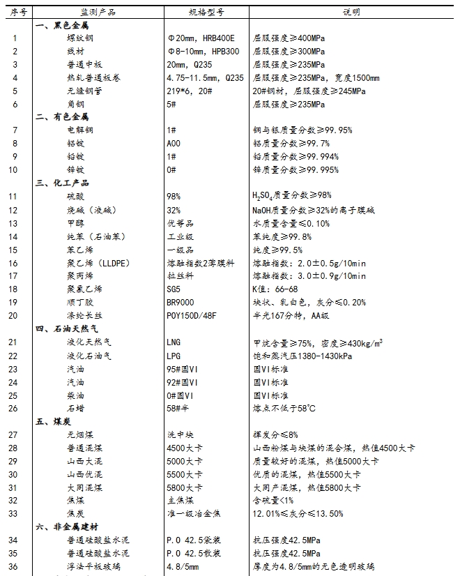 流通领域重要生产资料市场价格监测内容包括9大类50种产品的价格。类别与产品规格说明详见附表。