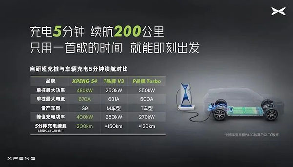 值得注意的是,今年8月,在小鹏汽车补能发布会上,小鹏发布了S4快充桩,大输出功率达480kW、单桩大输出电流达670A。在S4快充桩的支持下,小鹏G9实现充电5分钟,续航200公里。