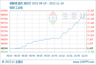 11月10日电池级碳酸锂国内混合均价价格为609000元/吨,与11月6日均价596000元/吨相比上涨了2.18%。 据生意社数据监测...2022-11-11 17:08:01