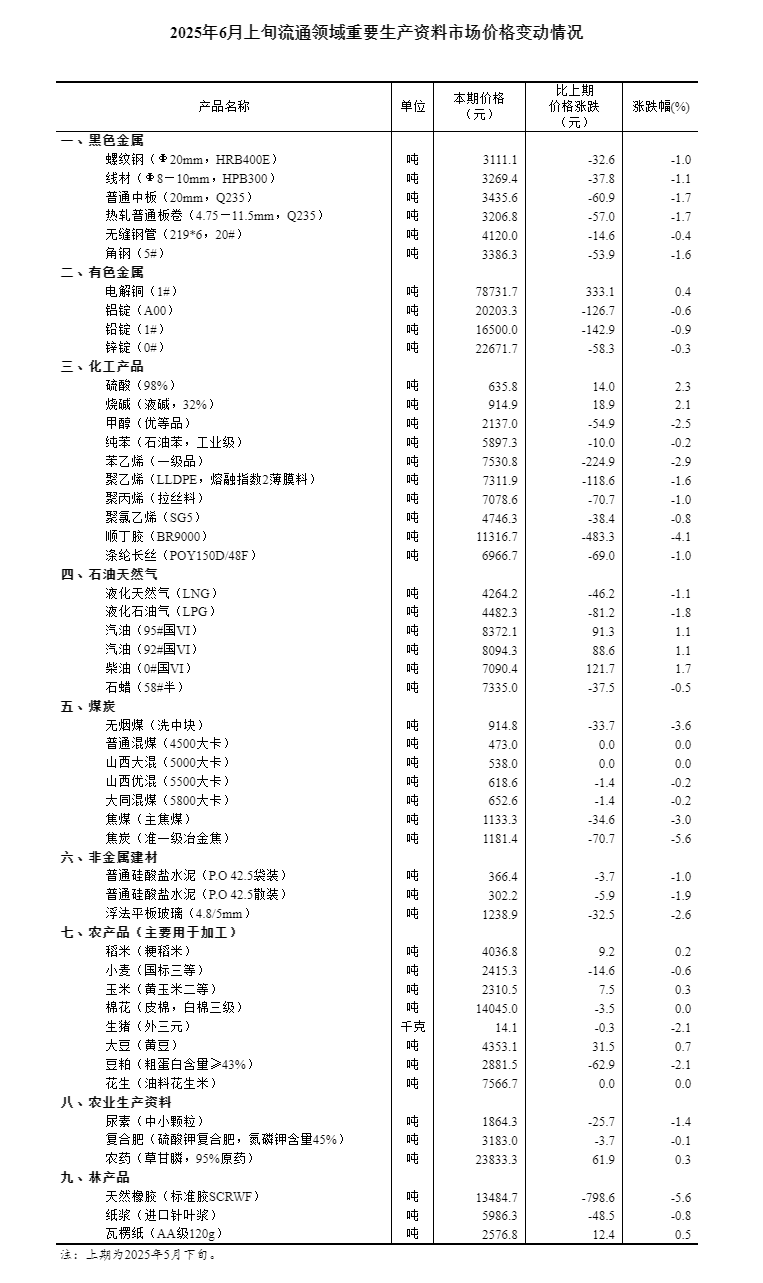 对全国流通领域9大类50种重要生产资料市场价格的监测显示,2025年6月上旬与5月下旬相比,11种产品价格上涨,35种下降,4种持平。