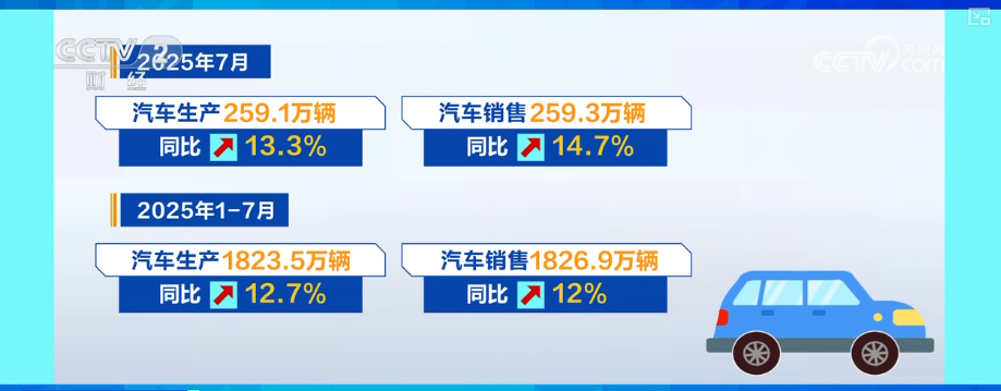 央视网消息:8月11日,中国汽车工业协会发布数据显示,7月,汽车产销分别完成259.1万辆和259.3万辆,同比分别增长13.3%和14.7%。1—7月,汽车产销分别完成1823.5万辆和1826.9万辆,同比分别增长12.7%和12%。
